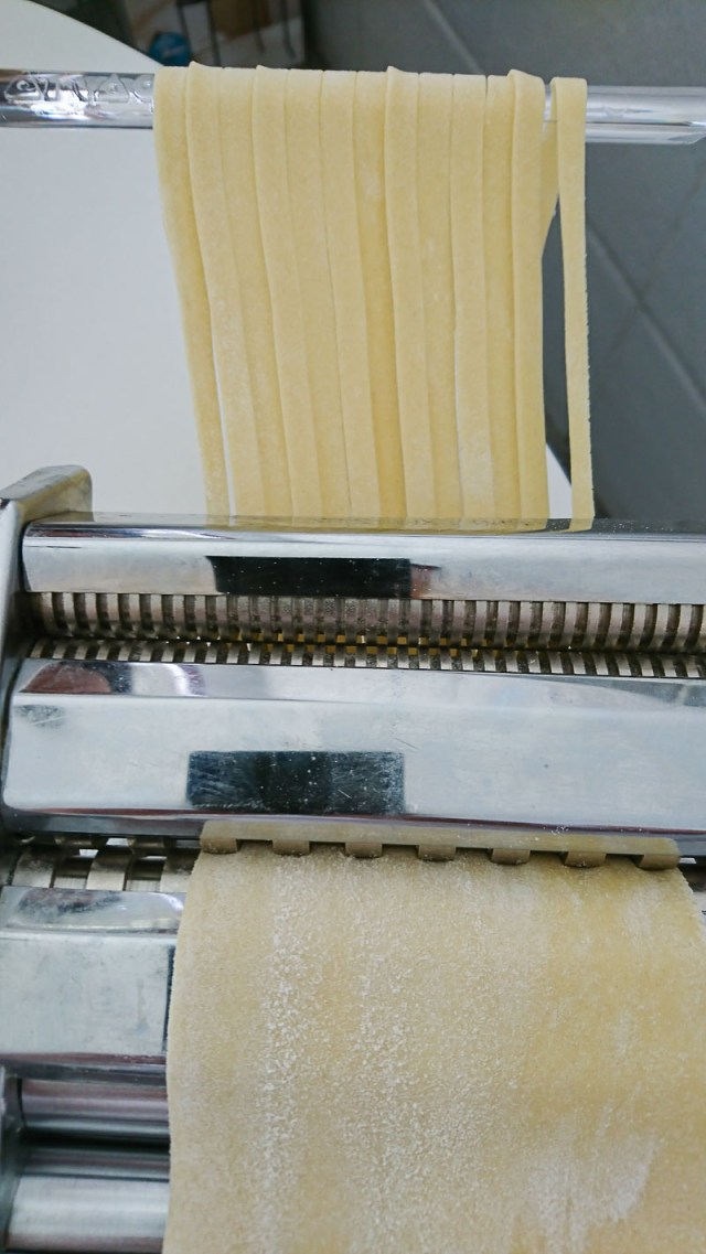 Cuando tenemos la masa bien estirada la pasamos a la parte del cortador de fideos. Si no tenemos la maquinita, hacen un rollito con la masa, como si fuera un pionono y con un cuchillo la van cortando del ancho que más les guste, pero yo diría que de medio centímetro está bien para que no se hagan lío.