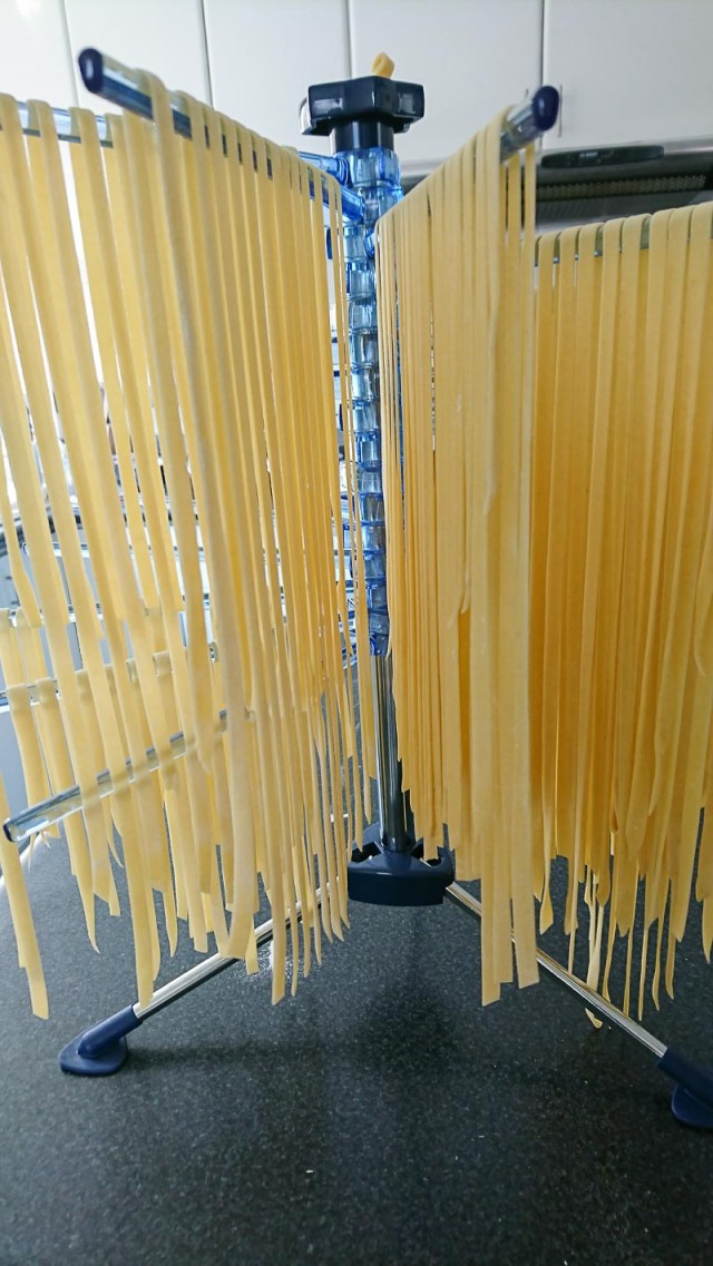 Una vez que tengan los fideos, los cuelgan para que se sequen y así no se queden pegados. Si no tienen el secador de fideos, pueden atar un cordel/hilo entre dos sillas, como si fuera un tendal de ropa, y ahí los van colocando. Ahí los dejamos para que sequen.
