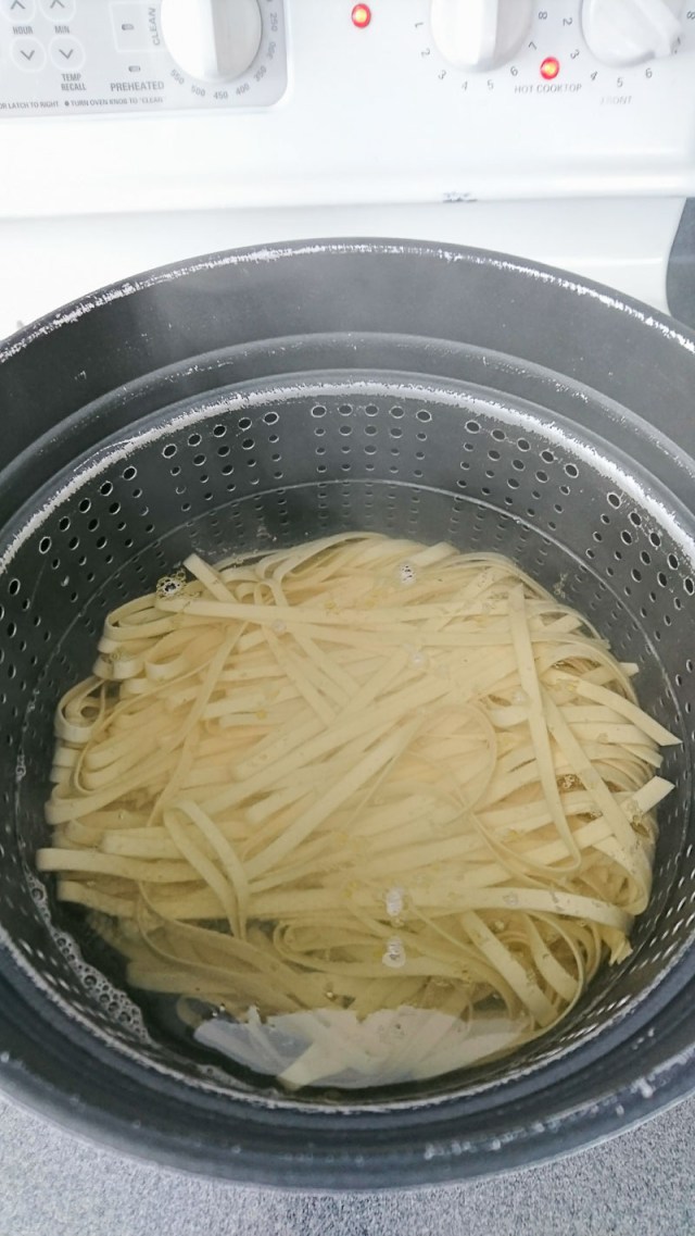 Hervir abundante agua, agregar sal y un chorrito de aceite de oliva y cocinar ahí los fideos. Ojo, como estamos haciendo pasta fresca los fideos estarán listos en 3 – 5 minutos, así que no le quiten el ojo a la olla, estén atentos.