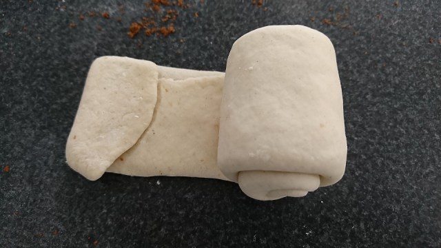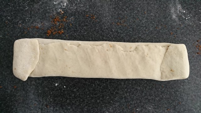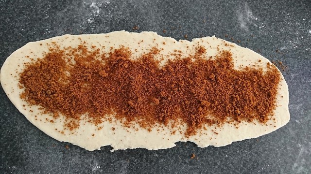 5. Colocar la masa sobre la mesa ligeramente enharinada, estirar a lo largo y cubrir con la mezcla de canela.