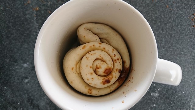 En eso, esa voz diabólica que tenemos a un lado del cerebro empezó a susurrarme al oído: tienes ganas de dulce, tienes ganas de queque, tienes ganas de un rollito de canela, tienes ganas de un Cinnamon Roll Mug Cake. Levanté la vista de la pantalla y me dije, ¿de dónde sacó esa idea?