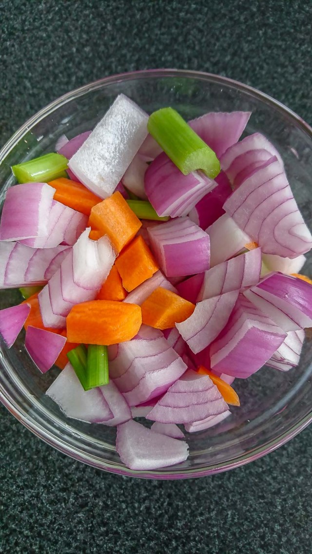 1. Procesar la cebolla, apio y zanahoria hasta que queden finamente picados y reservar.
