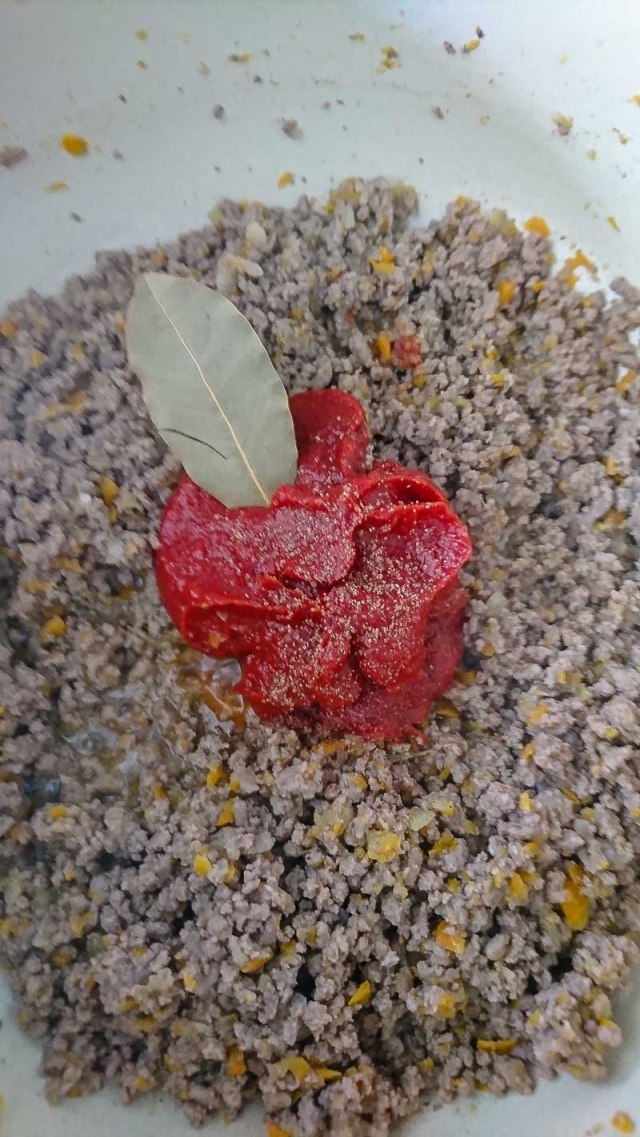 7. Agregar la pasta de tomate, el laurel y nuez moscada y cocinar, moviendo de vez en cuando, hasta que la pasta de tomate haya tomado un color oscuro.
