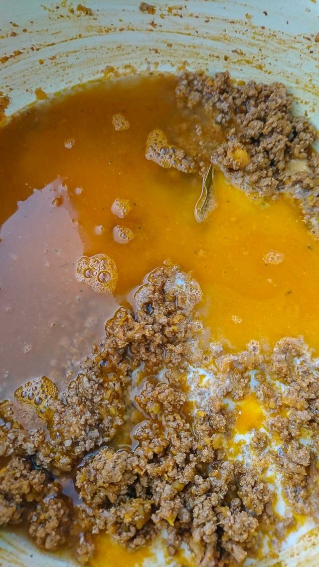 Sobre la carne, la cual se sugiere sea picada y no molida, la cocción larga hará que esta carne luego sea sumamente suave. Debo confesar que yo usé carne molida. No puedo decir que el resultado fue igual, no tengo forma de saberlo porque nunca he hecho esta salsa con la carne picada, siempre con carne molida. ¿Por qué no la hice con carne picada? Simplemente porque me dio flojera.