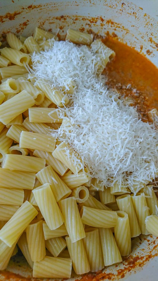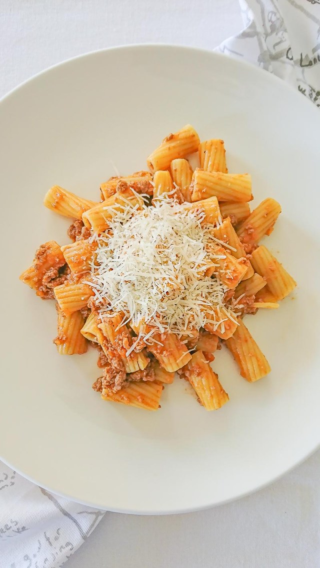 Por último, la pasta. Sí, eso lo sabemos todos, nada mejor que usar una pasta fresca, eso nadie lo pone en duda, pero claro, eso significaría que antes de hacer la salsa, la cual ya tarda horas, hay que hacer la pasta en casa. En ese caso lo óptimo sería usar pappardelle. Pero, al final de toda esta explicación encontré la luz, y es que si se usa pasta seca (la que compramos en el supermercado), entonces lo mejor es usar rigatoni. Aleluya.