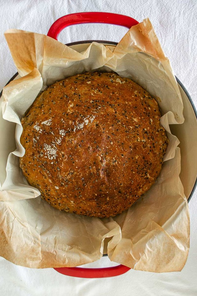 - Sin apagar el horno, y usando suficiente protección para las manos, con cuidado retirar la tapa de la olla, la cual estará muy caliente, y seguir horneando por 5 a 15 minutos, hasta que el pan esté cocido y dorado.