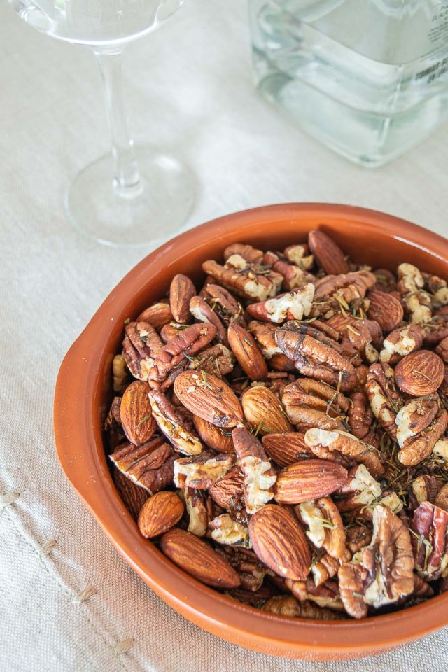 Esta receta llamada Bar Nuts la tomé prestada de Nigella Lawson, y créanme que es de lo más buena. Con la combinación de las nueces que más les guste y la hierba aromática de su preferencia, encontrarán que estas nueces son un delirio.