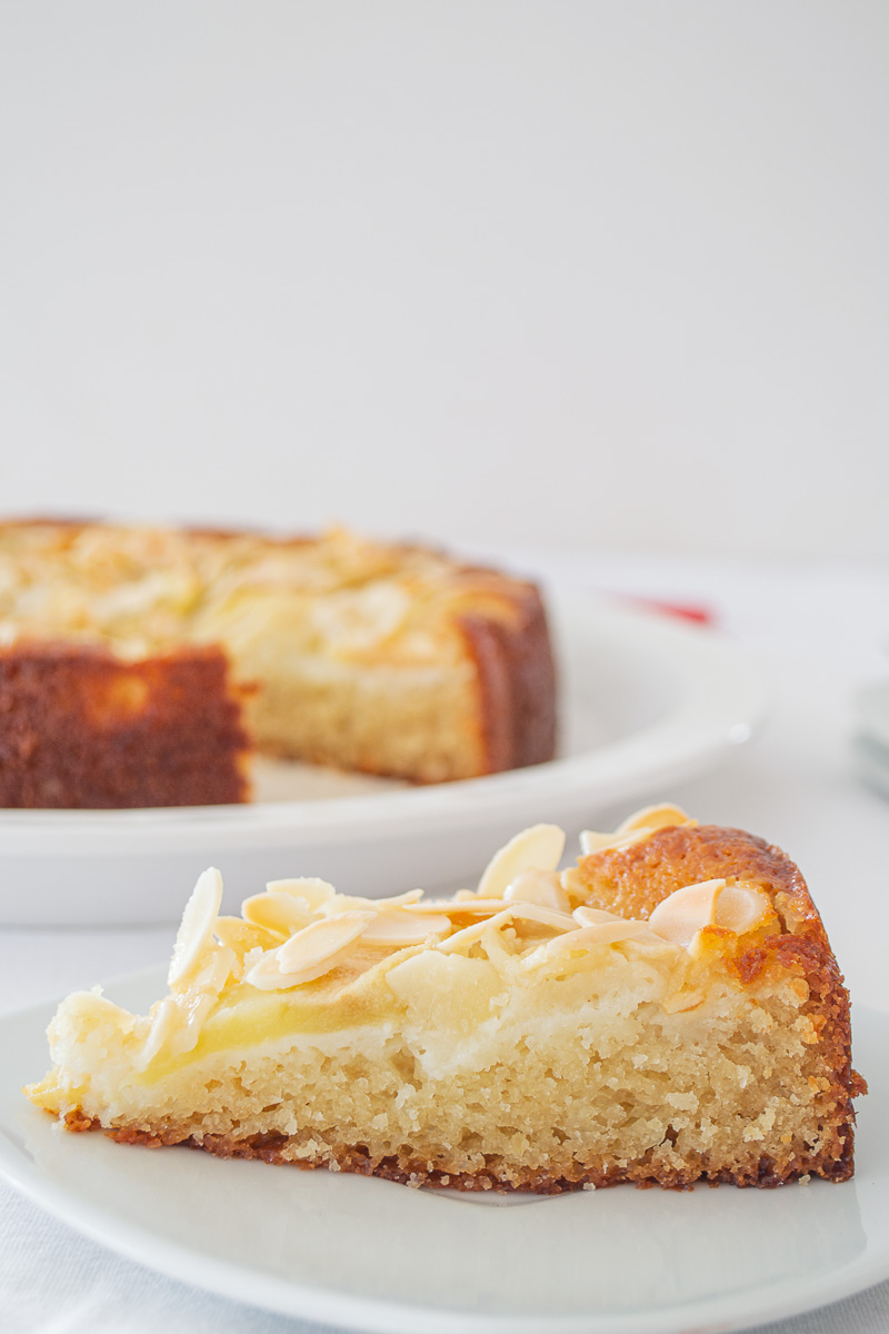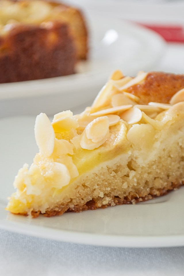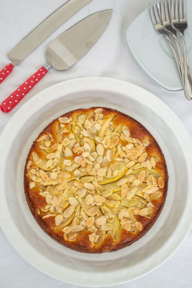 Sobre las almendras, si bien la masa tiene un poco de harina de almendras, el toque lo dan las almendras fileteadas que ponemos sobre las manzanas. Esas almendras le darán un crujiente muy rico a este queque, además que como elemento decorativo le va perfecto.